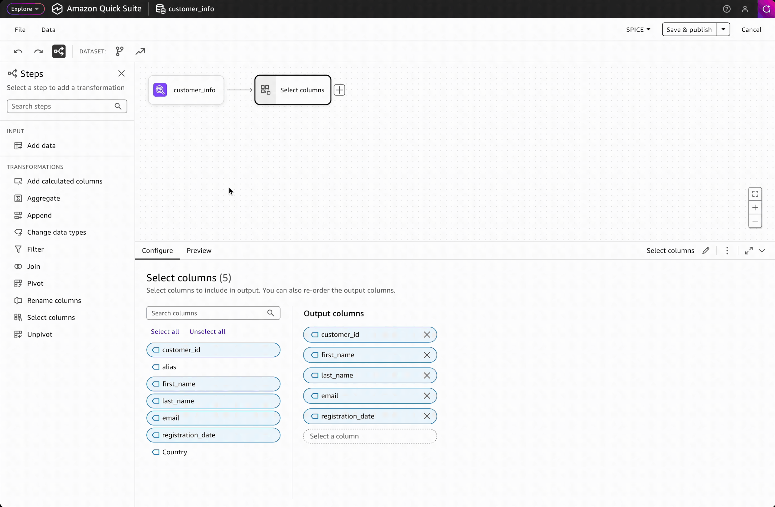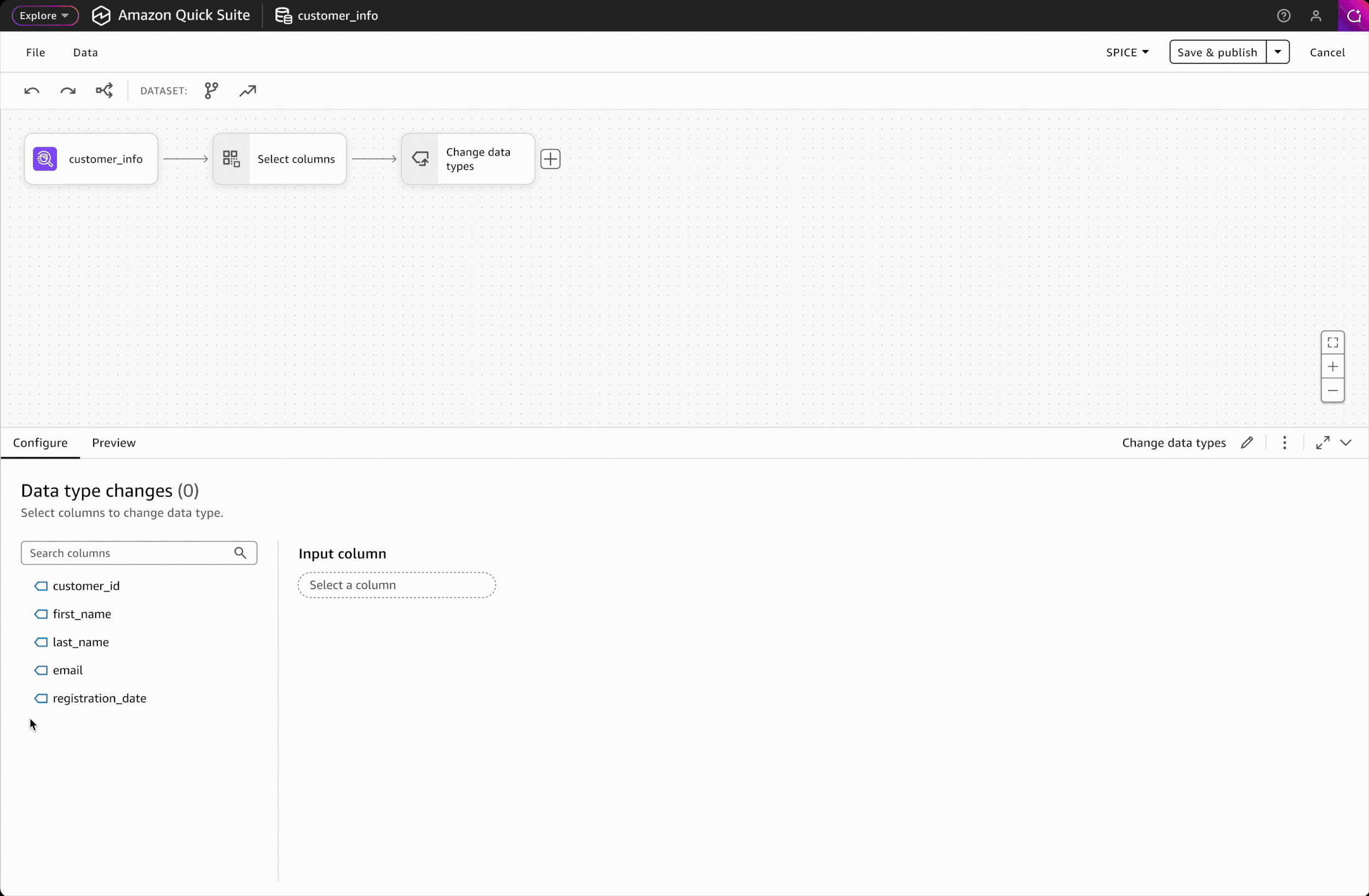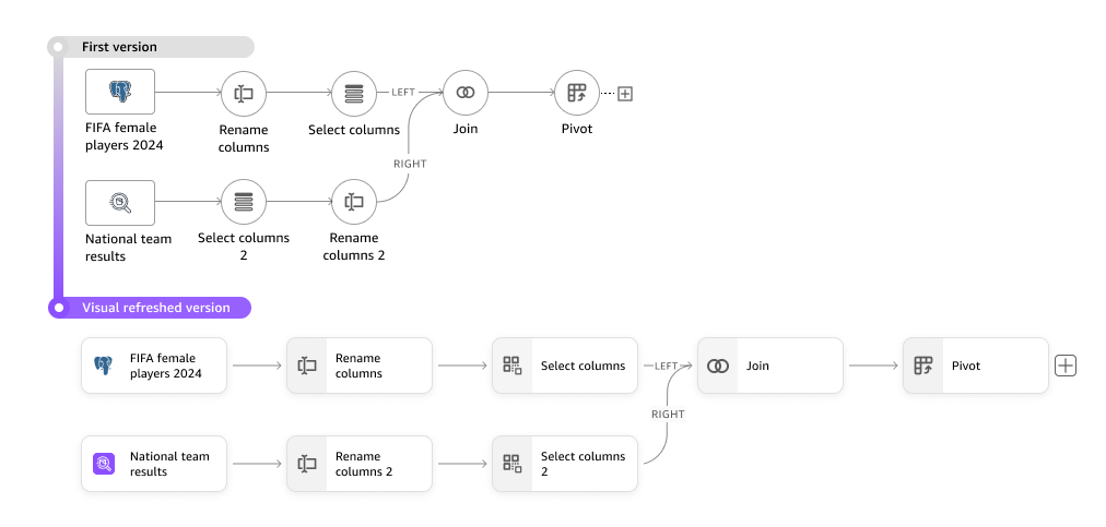 I proactively led a visual refresh of the data transformation workflow to align with Amazon Quick Sight's updated branding and design system.