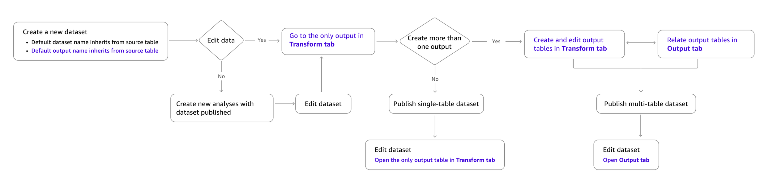 I simplified the end-to-end flow for creating and editing datasets while accommodating both single-table and multi-table capabilities. Transform is the default landing space for new datasets, based on two key findings: